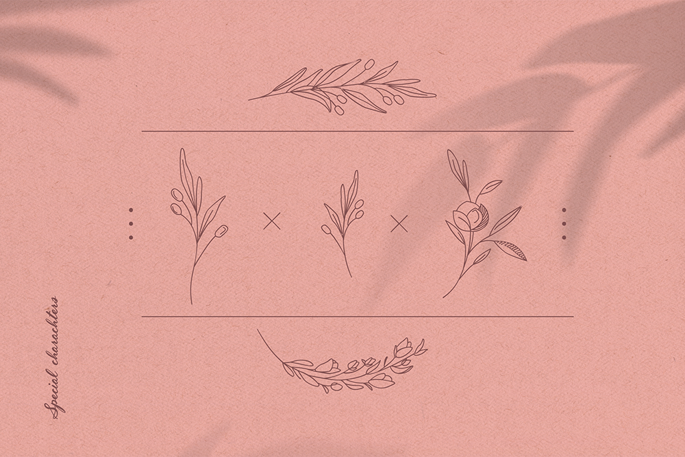 Font includes basic uppercase and lowercase letters, numbers and extended set of characters as well. Inola includes ligatures and stylistic alternates for some letters and floral symbols to include in your designs, find them all in glyphs panel.