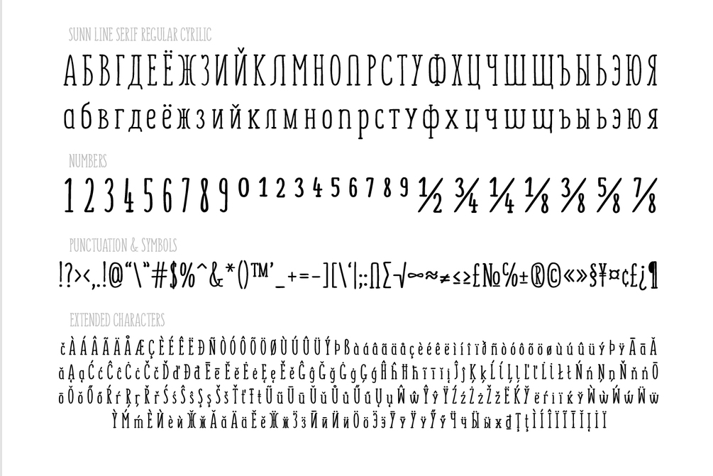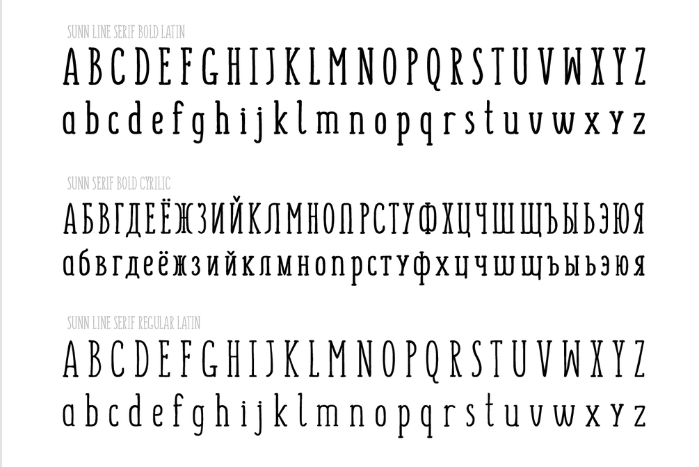 SUNN Serif Extended Font comes in two weights - Bold and Regular, it has latin, latin extended, cyrillic letters, upper case and lower case letters.