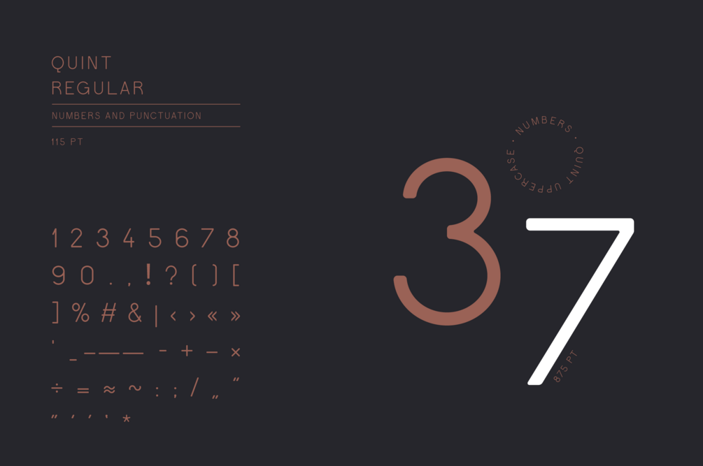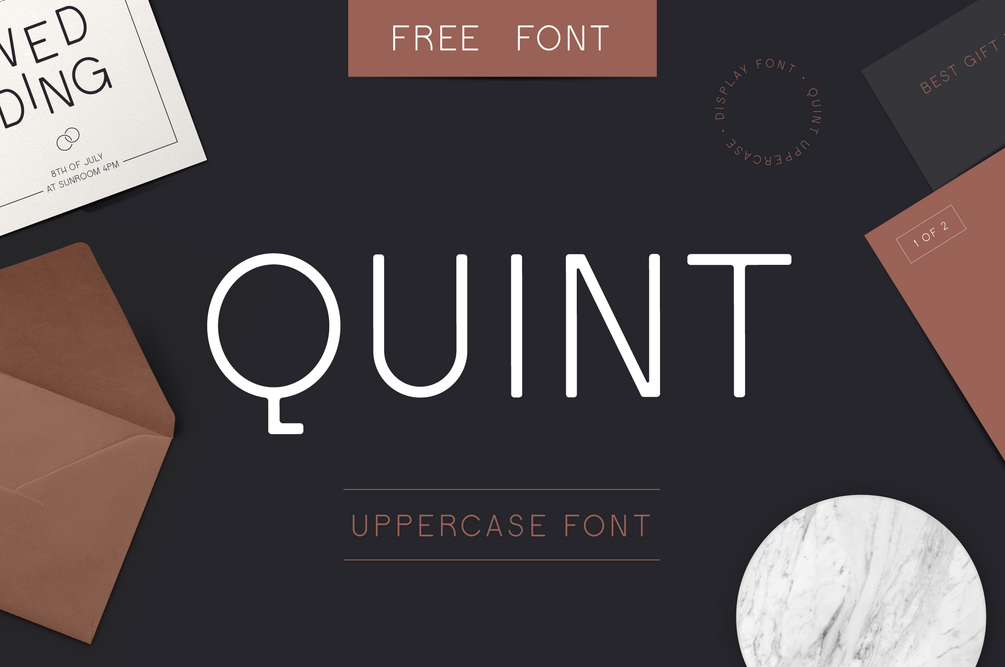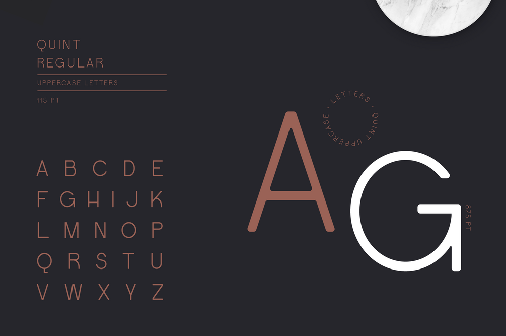 Quint Uppercase font has geometric construction with round details that creates elegant letter shapes. Modern and contemporary style with retro details make it an excellent choice for headlines, logotypes, branding, posters and magazines.