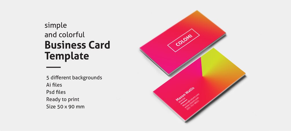 COLOMI Business Card TemplateGatis WildOnes Colomi is a colorful business card template, with ready to print files. $4.954.95usdPersonal$9.959.95usdCommercial24.95usdQuantityI want this!Size32.5 MBAdd to wishlist New wishlistShareShare on XShare on Facebook Copy linkCopy product URL
